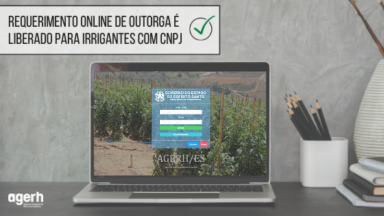 A Agência Estadual de Recursos Hídricos (Agerh) ampliou o Requerimento On-line de Outorga para irrigantes que têm Cadastro Nacional de Pessoa Jurídica (CNPJ). A plataforma substituiu, por um cadastro pela internet, os requerimentos e formulários de papel, que até março de 2020, eram entregues pessoalmente na sede da autarquia, em Vitória.
