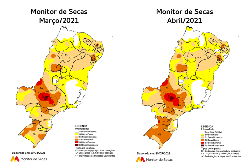 Em abril deste ano, em comparação a março, as áreas com seca tiveram redução em três das 20 unidades da Federação acompanhadas pelo Monitor de Secas: Alagoas, Paraíba e Pernambuco. No sentido oposto, dois estados tiveram aumento de sua área com seca: Maranhão e São Paulo. Outros 12 estados não tiveram variação da área com seca (Ceará, Goiás, Mato Grosso do Sul, Minas Gerais, Paraná, Piauí, Rio de Janeiro, Rio Grande do Norte, Rio Grande do Sul, Santa Catarina, Sergipe e Tocantins).