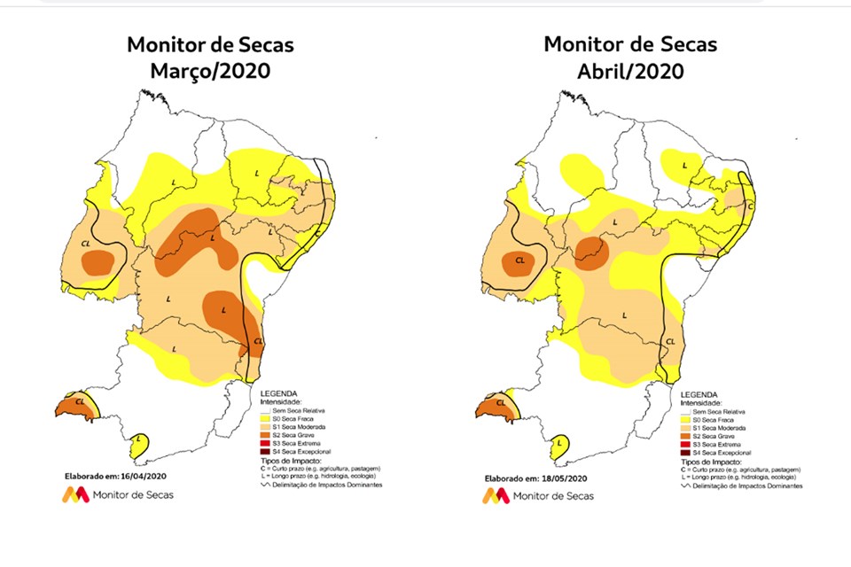 De modo geral, a seca no norte do Nordeste apresenta impacto de longo prazo, associado principalmente ao déficit hídrico de chuvas abaixo da média na região entre 2012 a 2018. No entanto, as precipitações observadas nos quatro primeiros meses do ano trouxeram melhora nos impactos de curto prazo e a consequente recuperação das pastagens, acumulação de água nos pequenos e médios reservatórios, além da recuperação de alguns perímetros irrigados.