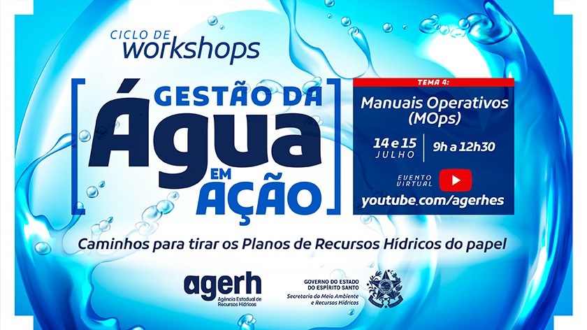 Nos dias 14 e 15 de julho, a Agência Estadual de Recursos Hídricos (Agerh) vai realizar a quarta capacitação do Ciclo de Workshops “Gestão da Água em Ação”, programa de encontros virtuais da autarquia responsável pela gestão de recursos hídricos no Espírito Santo. Desta vez, o tema será “Manuais Operativos (MOps) - caminhos para tirar os Planos de Recursos Hídricos do papel”.