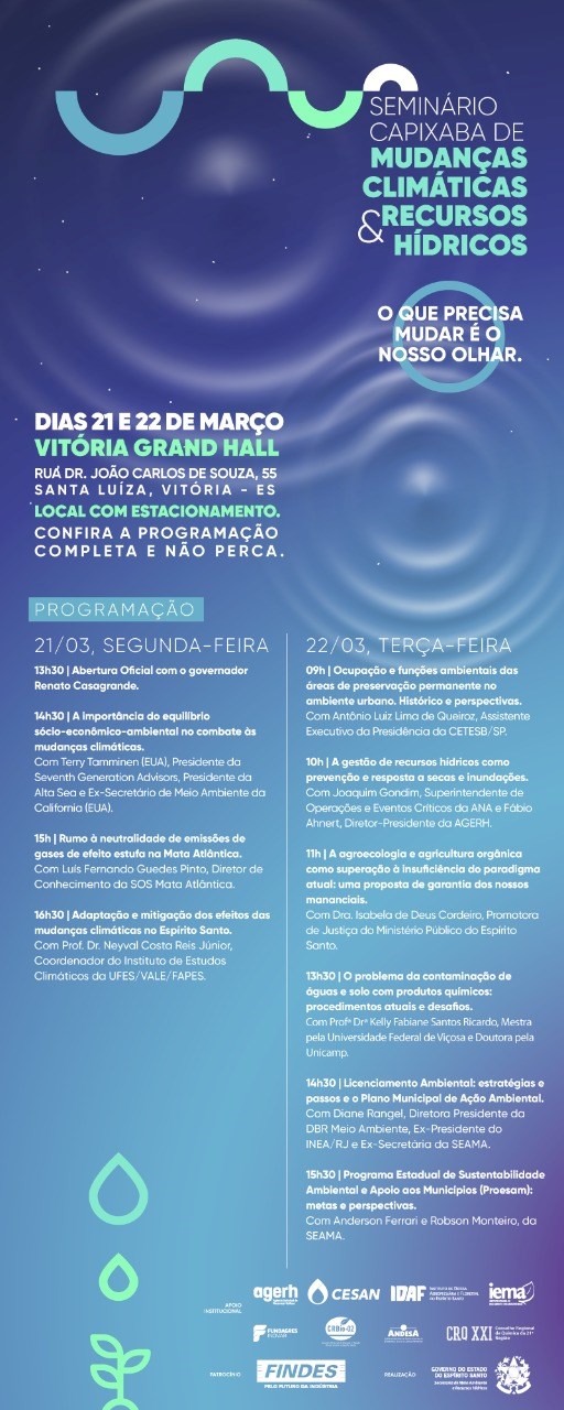 O evento será realizado no cerimonial Vitória Grand Hall, no Barro Vermelho, em Vitória, e reunirá especialistas em meio ambiente do Espírito Santo, do Brasil e do mundo para discutir soluções de combate às mudanças climáticas e preservação dos recursos hídricos em nosso Estado e em todo o planeta.